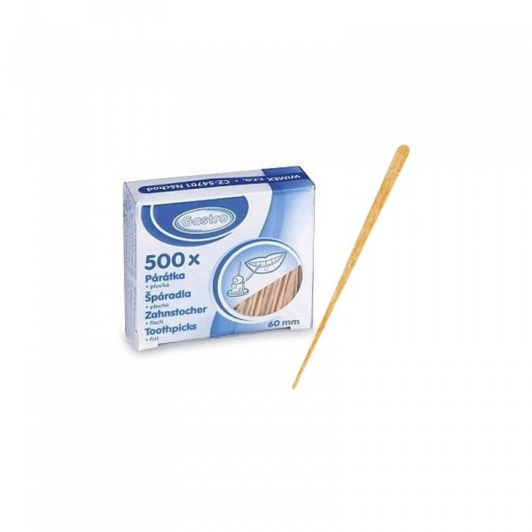 Párátka dřevěná plochá, jednostranně hrocená. Balení (papírová krabička) obsahuje 500 ks párátek. Vlastnosti produktu: Materiál dřevo. Délka párátka 60 mm, šířka párátka 1-3 mm. Párátka jsou jednostranně hrocená. Dodáváno v papírové krabičce.