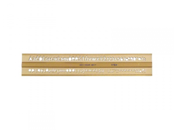 Písmenková šablona vyrobená z kouřového průhledného polystyrenu. Je určena pro práci s technickým perem 0,7 mm. Obsahuje znaky velké a malé abecedy, číslic a matematických znaků. Veškeré znaky jsou velikosti 7 mm a tvaru kolmého písma dle ČSN. Šablona je určena k popisování ve škole i v kanceláři.