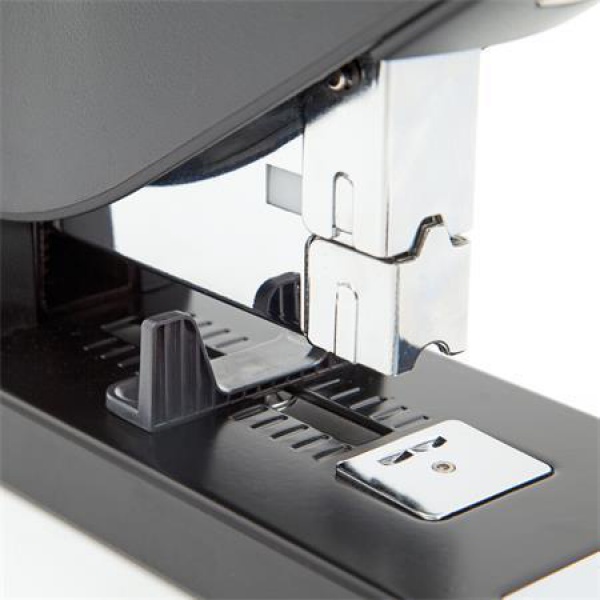 velkokapacitní stolní sešívačka, plastové tělo, kovová konstrukce, zepředu doplňovatelná, stisknutím tlačítka se podavač spinek uklouzne dopředu, tím lze rychle a jednoduše doplnit, nastavitelné vodítko papíru, popisovatelná jmenovka