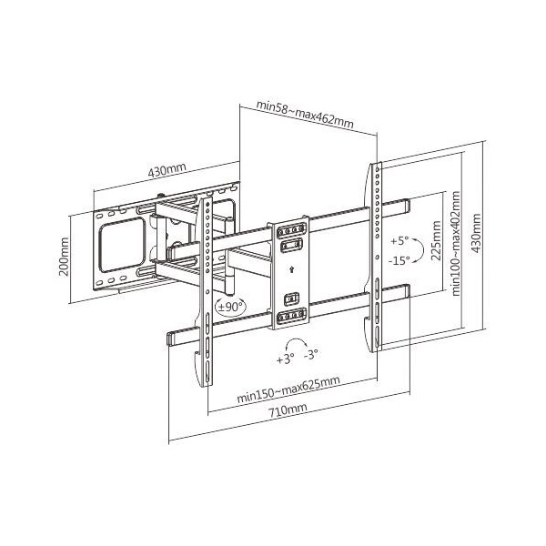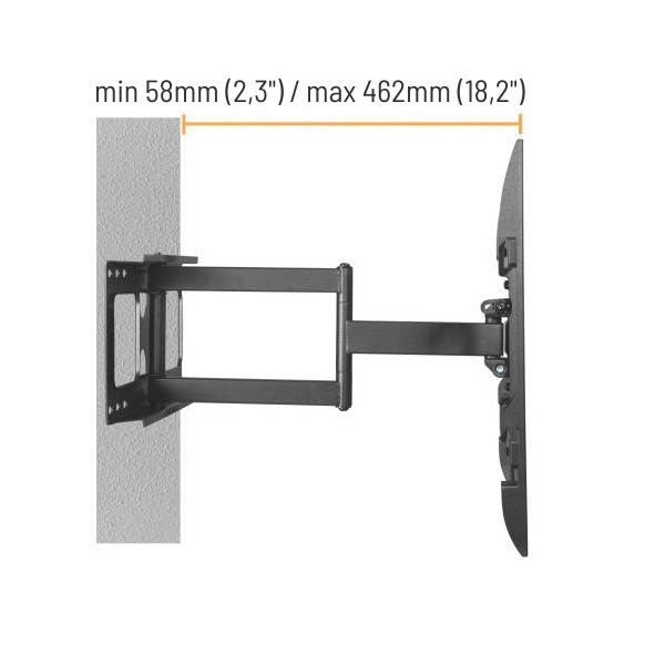 Výsuvný nástěnný držák LPA69-463D je určen pro instalaci TV s plochou obrazovkou s úhlopříčkami od 32“ do 70“. Jeho největší přednostní je robustní výsuvná konstrukce, díky níž unese TV o hmotnosti až 45 kg a zároveň umožňuje nastavit vzdálenost TV od stěny v rozsahu 58 mm až 462 mm, samozřejmostí je pak také velký rozsah polohování. Držák umožňuje snadné naklápění TV v rozsahu +5°~-15°, natočení do stran v rozsahu +90°~-90° a rotaci v rozsahu +3°~-3°, což maximalizuje flexibilitu sledování z libovolného místa v místnosti. Integrovaná svorka na kabely udržuje kabely uspořádané a chráněné.